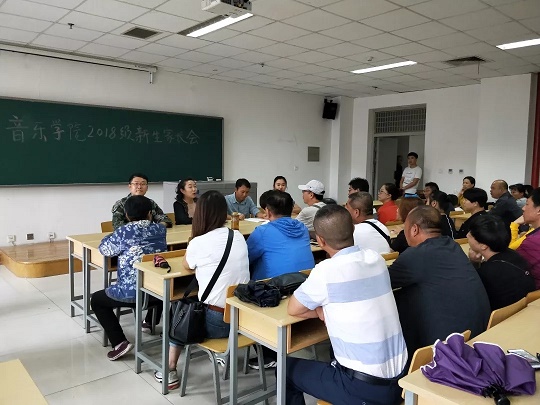 8月31号下午,我院在文萃校区L楼208教室举行"2018级新生家长见面会"。音乐学院党委副书记严津,学院团委书记、辅导员胡启立、辅导员贺紫剑、兼职辅导员仇雨薇及2018级学生家长出席会议。会议由胡启立主持。