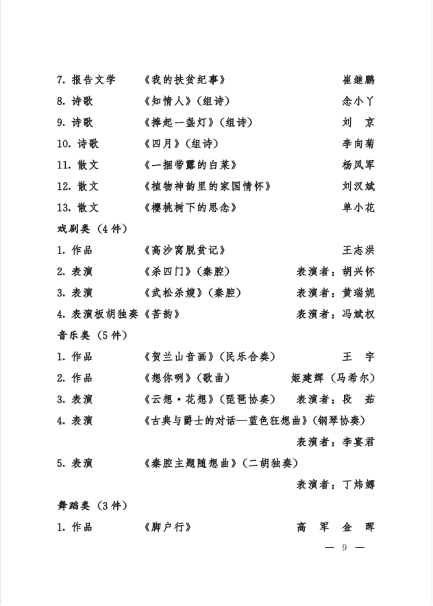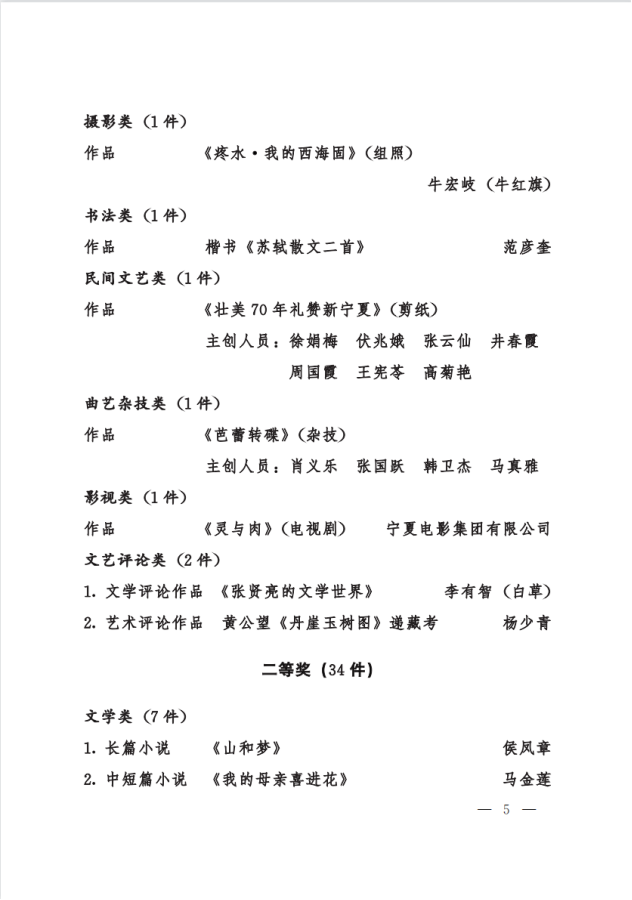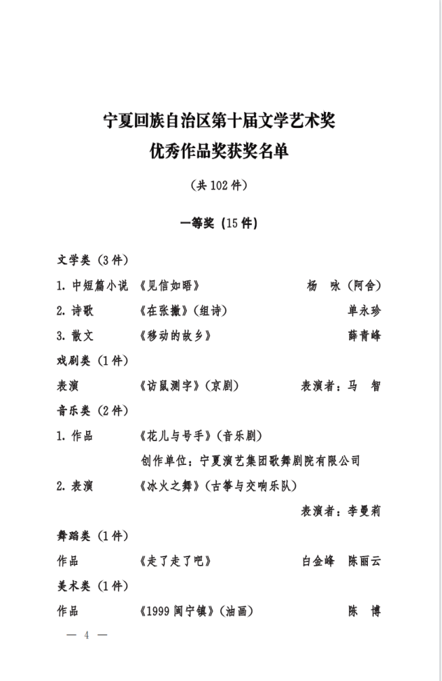 5月20日,宁夏回族自治区政府印发了《自治区人民政府关于奖励宁夏第十届文学艺术突出贡献奖优秀作品奖的决定》(宁政发[2022]18号),音乐学院共赢得四个奖项,涉及五名教师获奖。其中教师李曼莉表演的《冰火之舞》(古筝与交响乐队)荣获音乐类表演一等奖;院长雷兴明创作的歌曲《金沙滩—献给闽宁镇的建设者》荣获音乐类作品二等奖;副院长马冬雅创作的《花木深》(合唱)荣获音乐类作品二等奖;教师高军、金晖创作的《脚户行》荣获舞蹈类作品三等奖。特向全院师生报喜,向获奖老师祝贺!