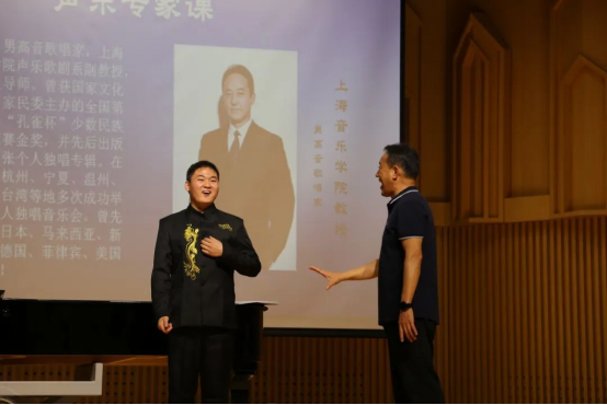 在一整天的课程中,赵老师生动有趣,干货满满的专家课,掌声不断、反响热烈!赵老师从学生在演唱中的气息、咬字、发音、演唱风格以及演唱的各个细节等方面进行细致、耐心的指导。将科学的发声概念与教学理念融会贯通地传达给师生,并通过示范教学,解答学生疑惑,分享个人学习经历与教学心得,让在场的师生受益匪浅,燃起对声乐学习更大的热情。