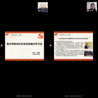 4月20日下午17时,音乐学院本科生党支部召开线上理论学习会议,重点学习领会习近平总书记3月15日给北京大学援鄂医疗队全体“90后”党员回信精神,以及“国家安全”相关理论知识。学院团委指导老师、学工办辅导员冯禹君主持会议,本科生党支部全体党员参加会议。