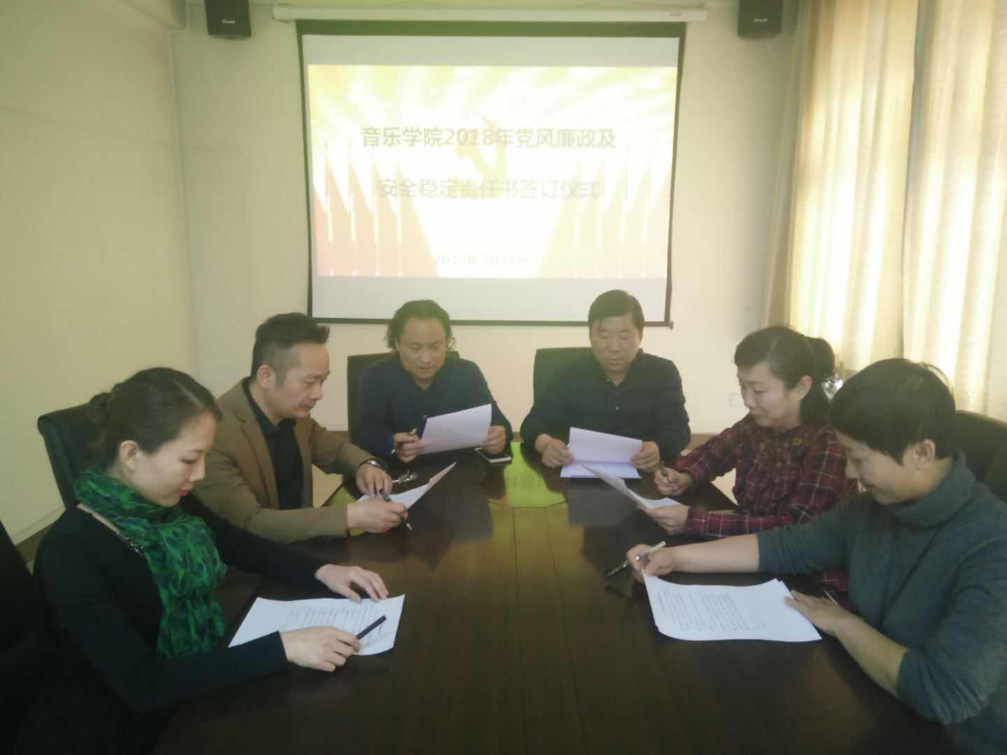 为进一步落实党风廉政建设责任制,维护学院安全稳定,2018年3月14日下午音乐学院在学院二楼会议室举行了党风廉政暨安全稳定责任书签订仪式。学院全体领导、三办主任及各系主任代表各部门参与了签订仪式。