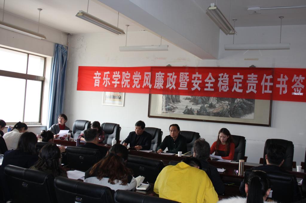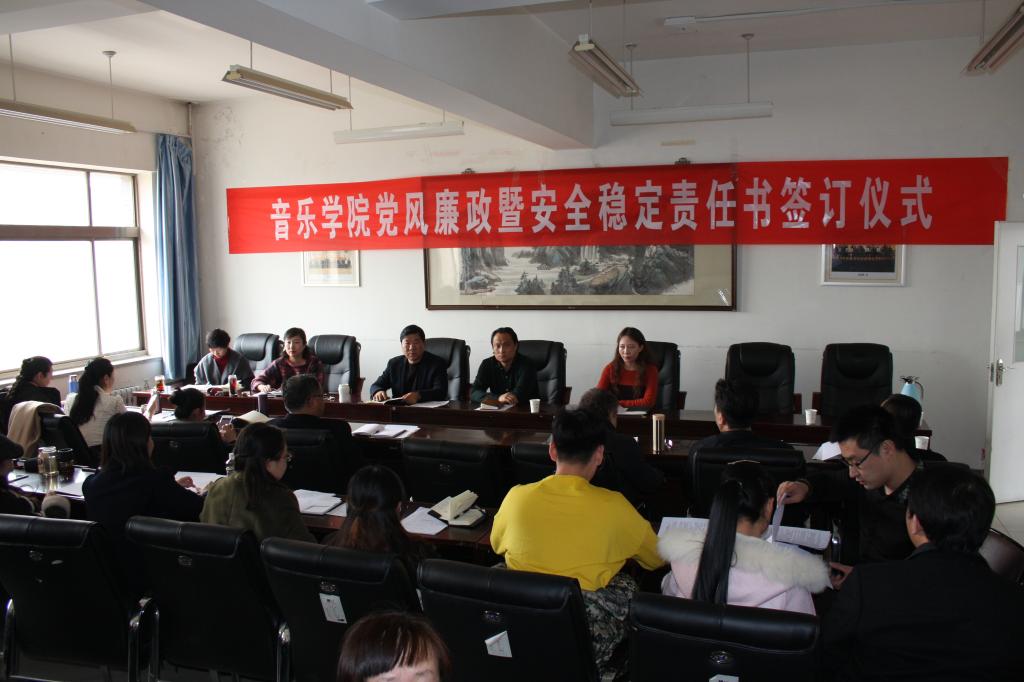 为进一步落实党风廉政建设责任制,加强反腐倡廉和安全稳定宣传教育工作,使广大教职工自觉绷紧廉洁自律和安全稳定的弦,2017年3月15日下午音乐学院在学院四楼会议室举行了全院教职工参加的党风廉政暨安全稳定责任书签订仪式。学院全体领导、三办主任及各系主任代表各部门参与了签订仪式。
