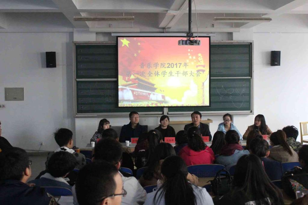 大会首先由各位老师根据各自的分工对新学期学生工作进行了详细部署。贺紫剑老师宣读音乐学院辅导员的分工情况,教导各班委要合理安排学院的工作任务;胡启立老师根据近期的学院活动和团委学生工作的情况进行了发言,他强调每一位同学不仅要积极参与集体活动,不断的丰富自己,而且还要尽可能的找到属于自己的位置,脚踏实地,干好本职工作。