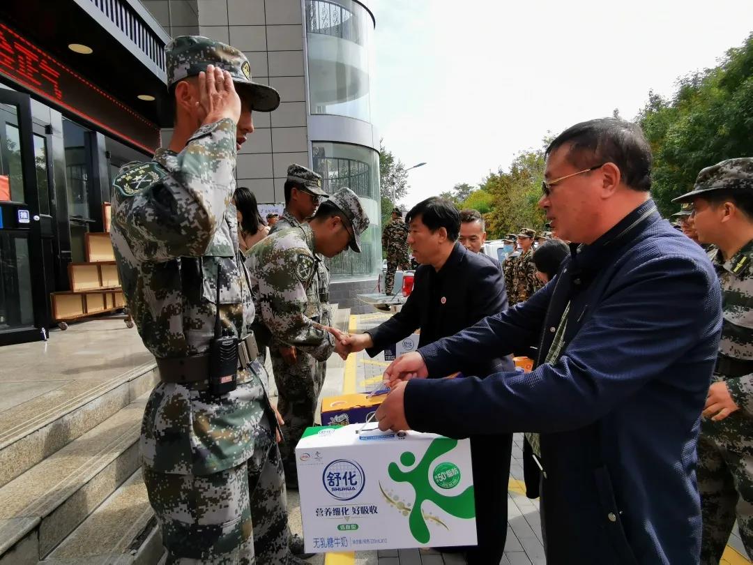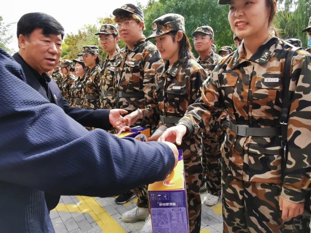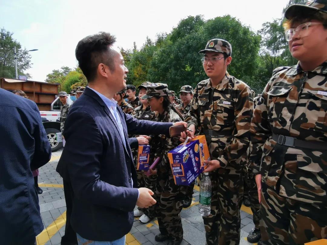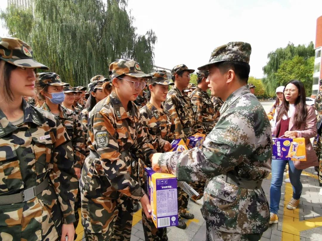 一营五连(音乐学院)的2020级新生整齐列队,以全新的精神面貌迎接学院领导的检阅和慰问。学院领导亲手将一箱箱爱心牛奶传递到参训教官和师生手中,对教官和老师的辛勤付出致以诚挚感谢,对新生的刻苦训练给予高度肯定。