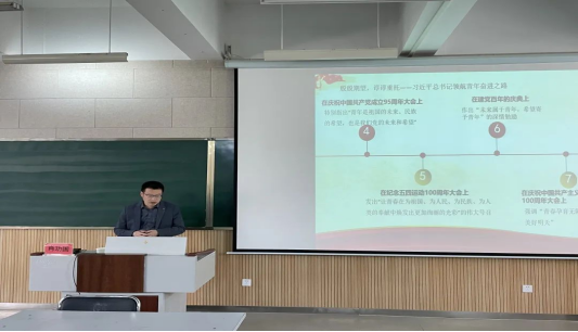 5月14日下午2点,音乐学院本期分党校培训班党课第四讲在德艺楼212教室开讲,本期党课的主题是《永远跟党走,奋进新征程——做有理想信念的学生骨干》,本次党课由校团委书记肖功国担任主讲人,音乐学院本科生党支部书记刘利宁主持,培训班全体学员和本科生党支部全体党员参加。