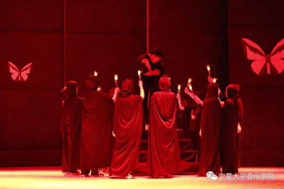 这种大胆而富有挑战的“考试”,让每位同学积极应对:导演组的同学极大程度锻炼了领导能力和决策能力,虽然排练中状况不断,但是每一次思想的碰撞都是为了音乐剧能够更好的被呈现。主演们作为音乐剧的重要力量,唱词的背诵,情感的设计,将梁山伯、祝英台等人的形象鲜活地呈现在舞台之上,情感真挚,演唱的选段让观众也为之动情。群演的配合,烘托整部剧的气氛,将梁祝二人化蝶一幕烘托到极点,序幕和舞蹈的设计也锻炼了学生的综合能力。后勤各方面负责的同学虽然只在最后谢幕的时候才露面,但在整部剧的衔接、服化道、辅助等方面起到了中坚作用。