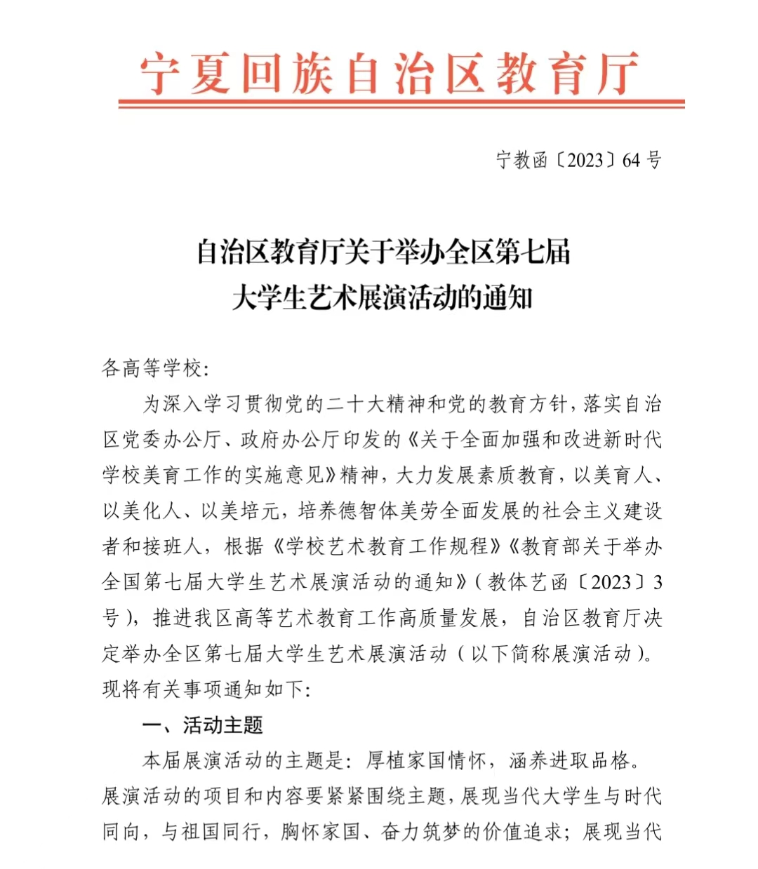 宁夏大学首届大学生艺术展演(个人、乙组)活动将于2023年10月11日-14日在新葡萄88833官网amg拉开帷幕!