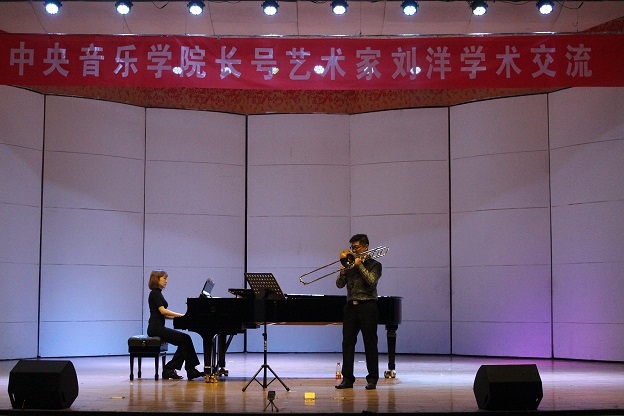下午3:30刘洋在音乐厅还举行了长号音乐会,整场音乐会刘洋老师共演奏了五首曲目,演奏的曲目风格多样,涉及了古典主义、现代主义风格及爵士风格等,台下观众掌声不断,喝声连连。刘洋老师的演奏完美诠释了长号的魅力,让在场观众享受到了一场视听盛宴。此次音乐会还吸引了宁夏音乐家协会、宁夏管乐学会、银川市及周边县市中小学管乐团负责人及学生代表、宁夏大学学生管乐团、石油城老年管乐团等500余名管乐爱好者参加。近些年来音乐学院屡次举办的此类高层次学术交流活动,使学院师生与国内外著名专业院校名师进行交流,为进一步提高学院今后的教学水平,逐步迈向国际化做出了积极的努力。