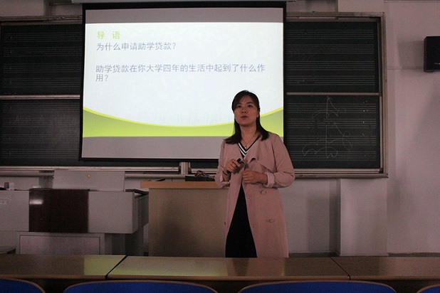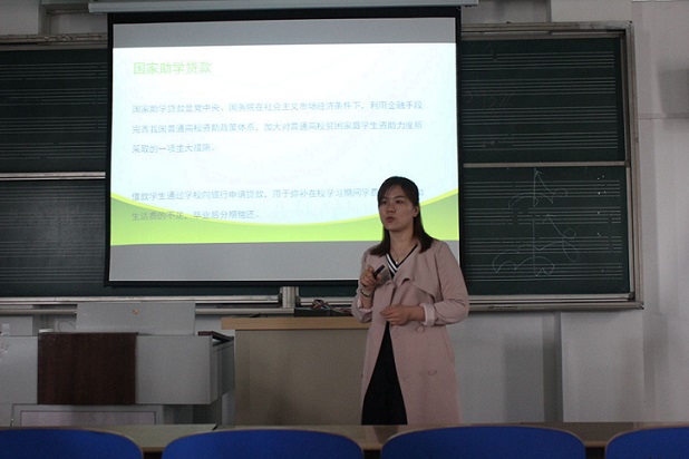 首先余洁将国家大学生资助政策向同学们做了详细的介绍,使大一新生对我校的助学政策有了初步的了解。最后又分别从为什么申请助学贷款、怎样申请助学贷款和毕业还款三个方面进行一一详细的说明。与此同时,余洁老师还对前来询问的同学给予了耐心细致地解答。
