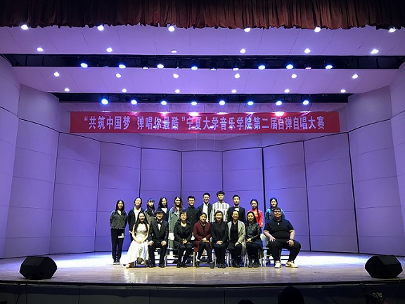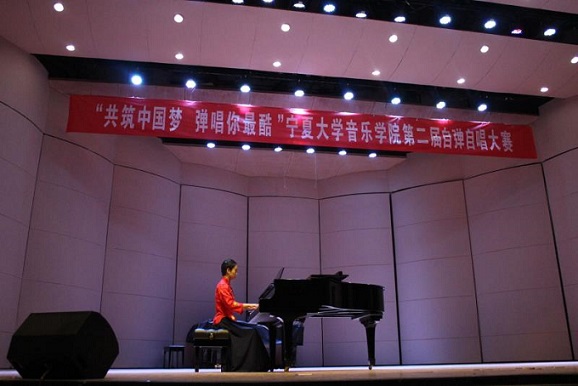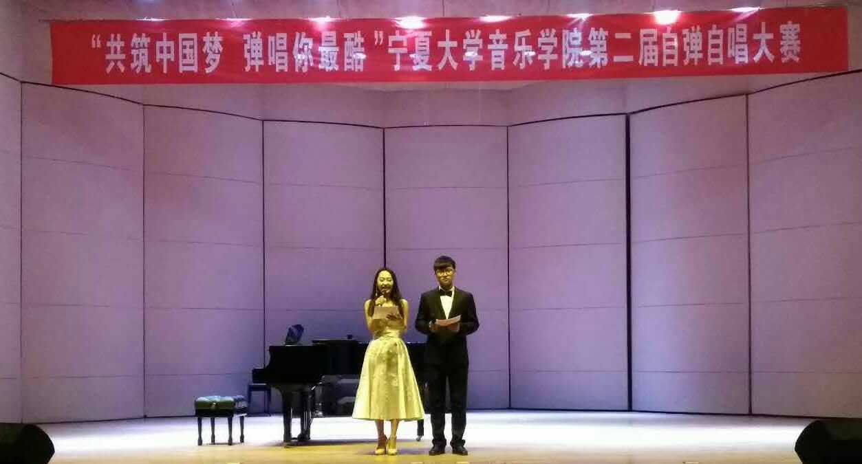 灯光与微笑构成的舞台,我们舞动激情的青春;笑声与歌声汇成的海洋,我们飞扬嘹亮的歌喉;永恒与温馨筑就的圣地,我们唱响时代的旋律;我们踩着悠扬的旋律,展现着动人的歌喉,放飞着青春的梦想。为推进宁夏大学校园文化建设,构建阳光、青春、和谐、幸福的校园文化氛围,4月19日下午两点,音乐学院在学院音乐厅举办了“共筑中国梦,弹唱你最酷”新葡萄88833官网amg第二届自弹自唱大赛。本次大赛由音乐学院党委副书记严津、音乐学院声乐系主任金弘道、音乐学院钢琴系主任郭爱萍以及音乐学院祁宝峰、吴丽霞、纳少军、高重阳、胡菁华、王婕斯老师担任评委。2016级全体学生观看了本次大赛。