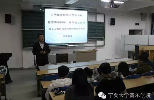 为了提高大学生的金融安全防范意识,11月8日晚音乐学院特别邀请了中国工商银行银川西夏支行营业室主任刘海军、副主任吴红鹰、同心南路支行副行长殷海涛、西夏支行个人金融业务电子银行客服经理郝亚谭、个人客户经理栾钰铨在音乐学院211教室举办了有关金融安全防范意识的专题讲座。16级全体学生及音乐学院全体学生干部参加了本次讲座。