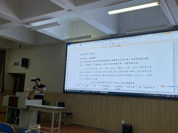 会上,潘珅从自评报告总体进度、自评报告阶段进展、专家进校准备工作三个方面进行通报,同时,潘珅就具体工作的推进安排、工作小组成员及分工进行了详细说明,并对参与音乐学师范专业认证工作的老师表示衷心的感谢,希望全院教师高度重视认证阶段性工作,为下一步专家进校做好充分准备。