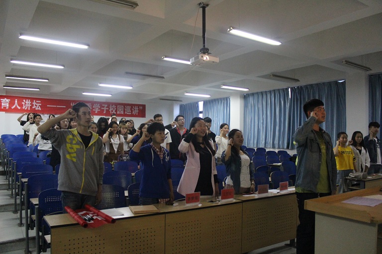 活动第一项,要求参加活动的全体人员起立并齐唱共青团团歌,重温入团情景,从同学们的歌声里我们又一次体会到了青年学生们团结的力量之大。紧接着,由音乐学院团委学生会主席周中豪带领着全体成员进行庄严宣誓。从他们一句句庄严的宣誓词中我们看到了作为当代青年的他们肩负的历史使命感和责任感。活动最后一项,主持人要求同学们在主题为“弘扬五四精神,践行青春誓言”的横幅上签上自己的名字。在这里他们许下了青春的誓言,并力争在以后得学习和生活中践行他们的誓言。
