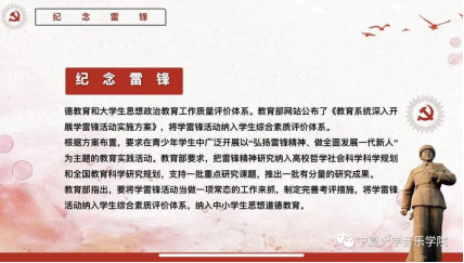 让我们弘扬雷锋精神,秉承宁夏大学“尚德、勤学、求是、创新”校训,发扬我校“不怕困难、不畏严寒,根深叶茂、本固枝荣”的“沙枣树”精神,争做新时代“向上向善”好青年。