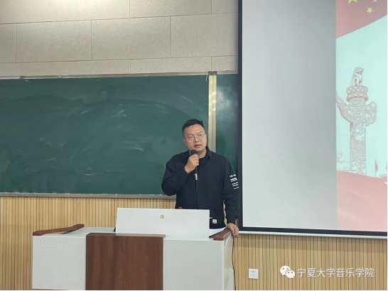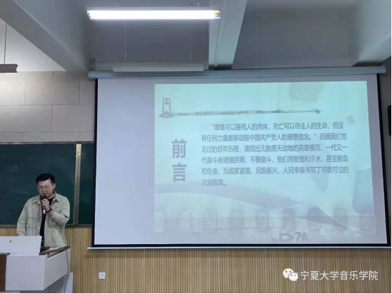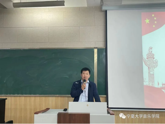 党委副书记贾述道讲话。他指出:此次活动是音乐学院在建党百年和党史学习教育背景下开展的一项重要活动,是我们对为党和国家建设事业做出突出贡献的革命先烈与英雄人物的深情缅怀,同学们一定要怀着崇高的敬意、严肃认真地参与其中;作为音乐教育专业的学生,我们既要能唱,还要能讲,既能上得了舞台,还得站得住讲台,希望同学们通过活动,厚植爱国主义情怀,争做新时代学生楷模。