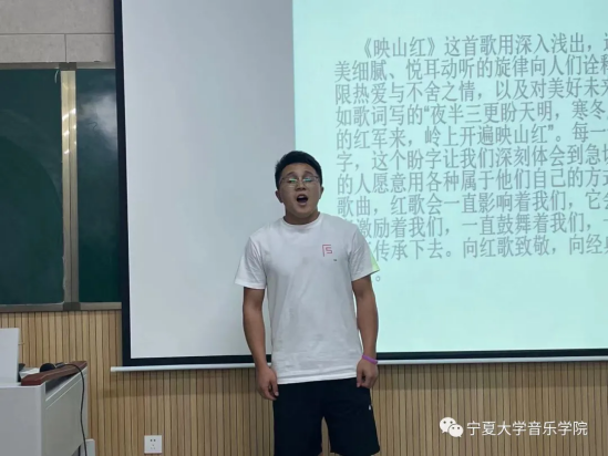 讲唱红歌组,同学们发挥专业特长,既有民族花儿,又有美声唱法,有独唱、有合奏,《南湖的船,党的摇篮》《教我如何不想她》《花儿与六盘》《共筑中国梦》……从经典红歌中汲取精神力量、理想力量、前进力量,赓续红色基因,致敬革命先烈。