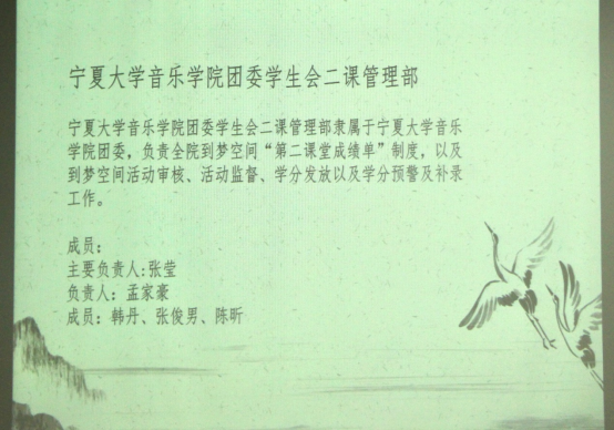 2021年9月5日晚8点,音乐学院在212教室开展了2021级新生“宁夏大学第二课堂成绩单制度”宣讲活动,活动由音乐学院团委“二课管理部”主要负责人孟家豪主讲,校团委“二课”。认证中心负责人、其他学院“二课”负责人代表受邀参会。