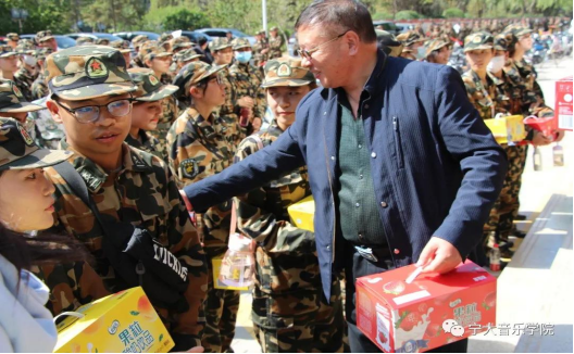 雷兴明院长与同学们亲切交流,他高度肯定了同学们在参训十几天中表现出的吃苦耐劳、团结一心、顽强拼搏的美好品质,对同学们在队列会操与军歌比赛中取得的优异成绩表示热烈祝贺,对承训教官与教导员的辛勤付出表示由衷感谢。他强调,“军训是同学们进入大学的第一课,军训不仅是国防义务教育、爱国主义教育的重要环节,也是青年大学生强健体魄、磨炼品格、超越自我、提升能力的重要环节,也是值得我们珍藏一生的美好回忆。他预祝同学们在军训汇报表演中绽放青春激情,展现音院风采。希望同学们尽快完成角色转变,以最好的状态开启即将到来的专业学习。随后,参与慰问的院领导为在场所有同学发放了学院精心准备的慰问物资,参训同学黝黑的脸庞上露出了轻松愉快的笑容。