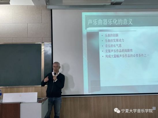温德青老师的学术讲座在德艺楼212教室召开。他以个人合唱作品为例进行分析,给同学们讲解了合唱作品的器乐化写作技术。他善于捕捉生活中、自然中的点点滴滴,把音乐作品融入生活,把日常生活融入音乐创作。在他的作品中,处处流露着对祖国母亲的热爱与眷恋。温老师向在场同学提出了三点希望:第一,希望同学们扩大知识面,提升专业技能。第二,希望同学们把自己的专业所学和社会需求结合起来,注重实际技能的培养。第三,希望同学们能够把音乐融入生活、融入自然。温老师提出,教师要引导学生充分运用校内外资源多途径开展音乐学习和艺术实践,不断提升专业综合能力和音乐核心素养。