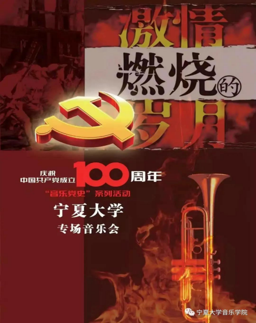 2021年是中国共产党成立100周年,为进一步深化党史学习教育,用音乐传承红色基因、赓续精神血脉,凝聚起全校师生奋进新征程的磅礴力量。由宁夏大学主办,宁夏大学党委宣传部,新葡萄88833官网amg承办的庆祝建党100周年“音乐党史”系列活动宁夏大学专场音乐会将于2021年6月12日在宁夏人民剧院如期举行,诚邀您拔冗莅临!